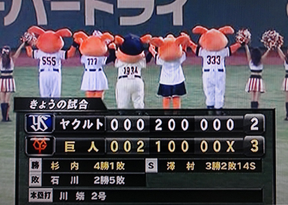 今日の決勝打はなんと杉内投手 亀井選手と坂本選手のタイムリーで2点先制した直後、川端選手に2ランを打たれ同点に。その裏、杉内投手のタイムリーで1点追加 6回に満塁のピンチを迎えたけど杉内投手が抑えた瞬間、今日は勝った!と勝利を確信しましたよ。 今朝マシソン投手にベイビーが誕生したそうで、マシソン投手はお休み。(おめでとうございます!) 小山投手‐山口投手‐澤村投手の無失点リレーで1点差で勝利しました。 昨日村田投手はスタメン外れたけど今日は相性の良い石川投手だったのでスタメン起用され3打数1安...