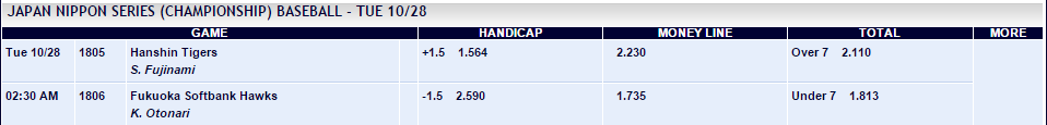 JUGEMテーマ:プロ野球予想 ようやく流れに乗りましたね! クライマックスシリーズの賭け方も ちょっと分かったような気がします(^_^;) でも、 その答えは今夜出ると思いますけれど・・・ 昨夜は 2試合とも取れました。 オッズが高い方なので 結構美味しくいただけました! 両チームの皆様 ごちそうさまでした。 オンライン麻雀は相変わらず調子よく 大三元まで上がれましたので そろそろ、ブックメーカーも行けると確信していたので 一安心です! では、今日も行ってまましょう! <...