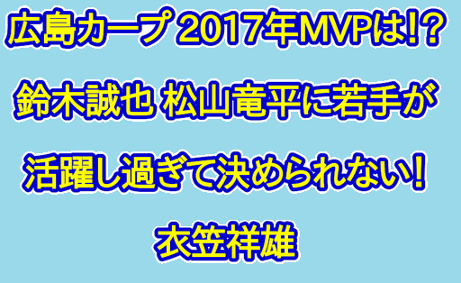 JUGEMテーマ:広島東洋カープ 今回は、YouTubeにあった 『広島カープ 2017年MVPは!? 鈴木誠也 松山竜平に若手が 活躍し過ぎて決められない! 衣笠祥雄』 を アップしました。 MVPか〜だれになるんだろ? σ(^^)的には、シーズンを 3番として、ずーっと出続けた 丸かな〜?・・・続く