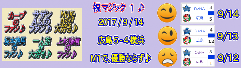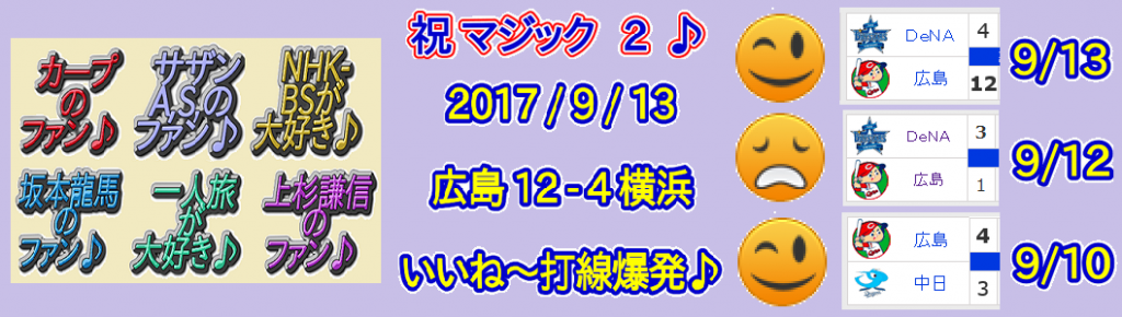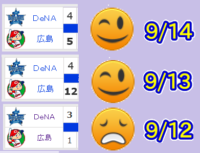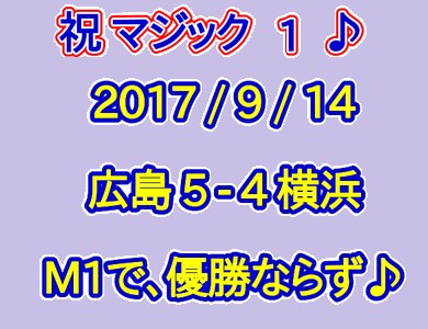 JUGEMテーマ:広島東洋カープ 今回は、『9/14広島5-4横浜 ハイライト動画に ミュージックを付けて♪』 について、書きたいと思います。 いや〜いい試合でしたね〜♪ 試合終了後、阪神の動向を 見守っていたのですが ・・・(苦笑)・・・続く