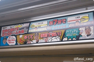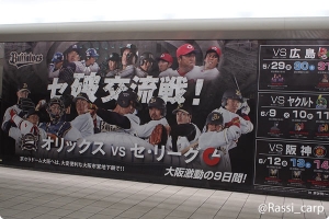 昨日から交流戦でカープは大阪へ。 京セラドームへ観戦に行ってきました 壁面の大ポスターには「セ破交流戦!」の文字が。 選手がうまく配置されていてカッコいい〜 柱にはバファローズのマスコットキャラクター(ベルちゃんだったかしら) 京セラドーム最寄のドーム前千代崎駅、構内はすでに野球ムードでした。