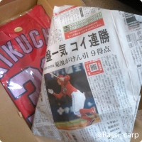 年が明けてはや2週間。寒い日が続いていますね 室内にいると暖房がきいているので、ついつい寒さを忘れがちですが、外に出ると一気に冷え込みます たまには世間話的なものでも〜と思って、今日はのんびり綴りたいと思います (とはいっても結局カープ絡みのことになるのですが) まずはこちら スマホの写真を整理してたら発見した一枚 これは初めてカープの公式通販を利用した時のものです。 (菊池のTシャツと、小物をいくつか購入) 届いた箱を開けたら…緩衝材がわりに入っていた新聞が菊池でした