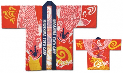 2015年の新しいカープグッズ 今日も更新されていました 第二弾は応援&スラィリーがテーマみたいです。 鯉の舞ハッピ 【鯉の舞ハッピ 3,800円】 サイズ:身丈85cm、身巾59cm (CARP OFFICIAL GOODS SHOPより) 応援用のはっぴ。 はっぴといえば応援団の方なイメージがあります 2匹の鯉が大きくプリントされていてなかなかの派手さですね ちょっと着てみたい気もしますが、私が着たら催し物会場の人みたいになりそうです