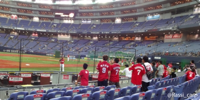 金曜に、生まれて初めての野球観戦に行ってきました (普段はテレビ観戦ばかり) 場所は京セラドーム大阪 カープvs阪神です。 早めに行くと練習風景が見られるとのことで、開門時間と同時に入りました。 入ると… ほんとだ、カープの選手が練習中 3塁側の席だったのですけど、思っていたよりグランドが近かったです わーわー(テンション急上昇)