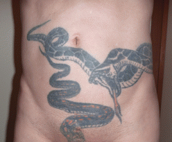 JUGEMテーマ:楽しい事 俺が、最初に身体を改造したのは、真珠を入れた事で、 次に改造したのが、下半身に入れた蛇の刺青だった。 きっかけは、騎上位でSEXしている時に、女のマンコに蛇が入っていったら、 物凄く卑猥だろうと思ったのだ。 20代で金も無いので、自分で入れる事にした。 本を読んで刺青の方法を学び、実行に移した。 下半身にマジックで、蛇の絵を描き、鏡を見ながら蛇の具合を調整した。 初代の蛇は、臍下からチンコの付け根まで、ノタクッテ行き、チンコを蛇の胴体と頭に見立てた。 それ...