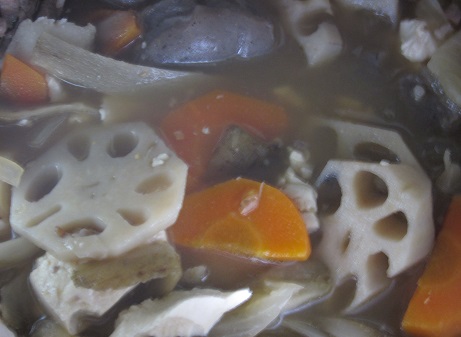 JUGEMテーマ:今飲みたいもの!! 宮古島のお土産の八重山味噌で豚汁。 冬はあったかくいただきたい。 ごぼうをごま油で炒めてから肉を酒をいれて 炒める。生姜、にんにくを加えて蓮根やにんじん、こんにゃく(熱湯で煮て洗ったもの) を炒めて鍋1/3の水へエビネ芋を加えて煮る。しばらくしたら先ほどの野菜も 追加します。かつおだし(粉タイプ)もいれて味噌をいれれば出来上がり。 我が家は八重山味噌を使いました。画像はその写真。