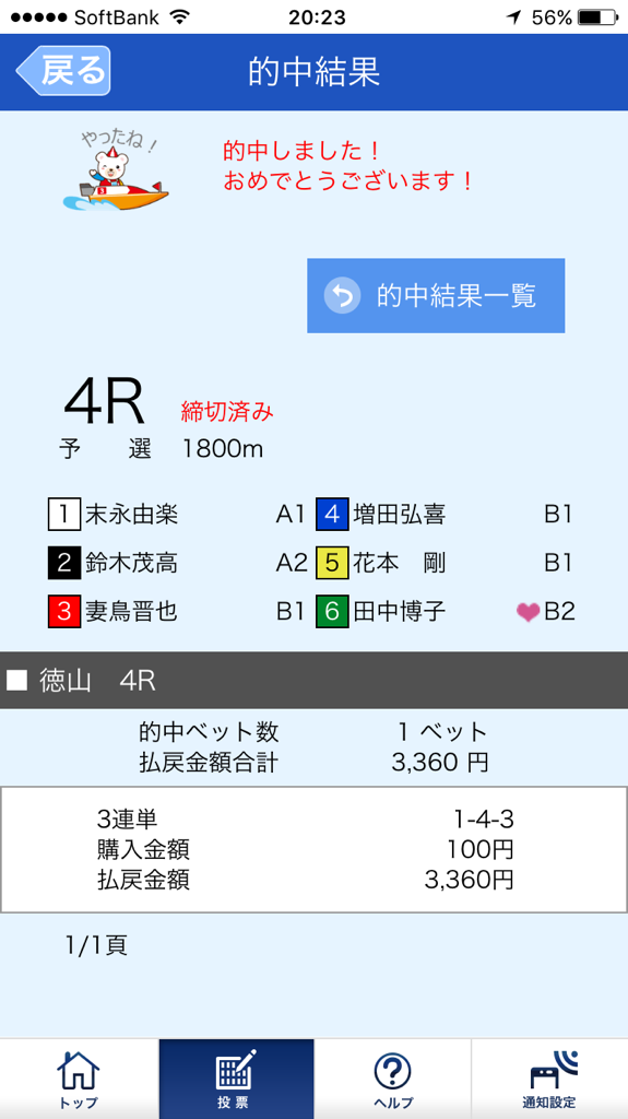 JUGEMテーマ:最近のマイブーム 徳 山 一般 デイリースポーツ杯争奪戦 開催期間中マーク選手 妻 鳥 晋 也メンドリ シンヤ 初日 2R 5着 11R 4着 1'55"7 二日目 6R 4着 1'55"5 三日目 4R 3着 1'54"1 1-4-3 船券絡み 3,360円 四日目 1R 6着 7R 3着 1'54"9 1-2-3 船券絡み 1,890円 最終日 8R 安 井 瑞 紀ヤスイ ミズキ 初日 8R 転覆 二日目 4...