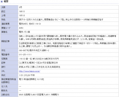 JUGEMテーマ:原発 今日は、北海道電力(株)(証券コード:9509)が泊原発が停止していることによる経営への影響について意見したいと思います。 まず、北海道電力(株)の四季報を見てみましょう。 1.北海道電力(株)の概要(四季報) 3.11の東日本大震災が起きる前の電力株は、ほとんどが50円配当を安定的に出していて、リスクが低い安定した株であるという評価でした。四季報が201...