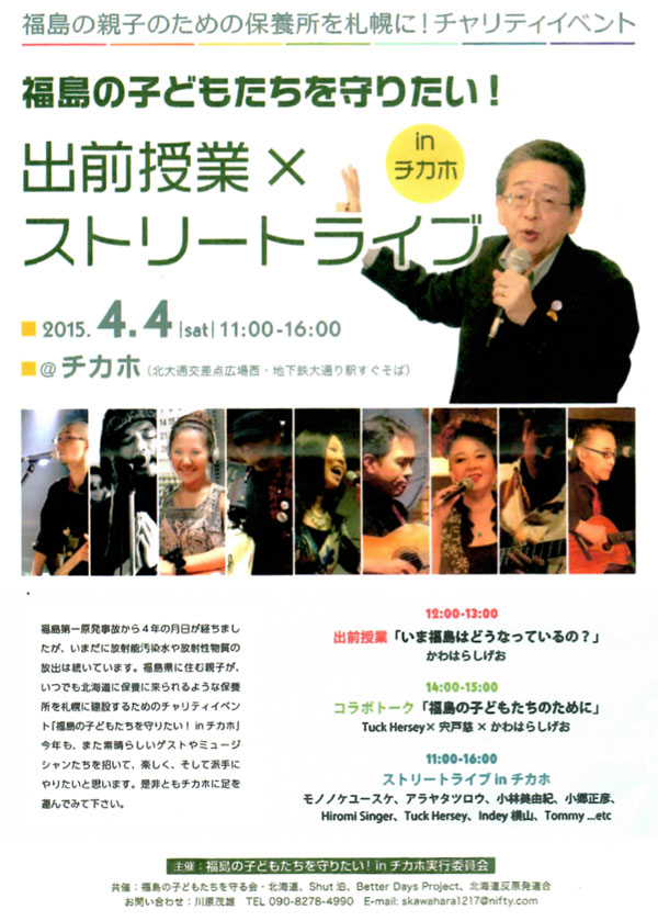 チェルノブイリ・ウイーク映画上映会(shut泊賛同) ■会場: プラザ2・5(狸小路5丁目) ■日時/プログラム:2015年4月24日(金) 上映タイムテーブル 10:10〜12:25 「日本と原発」(135分) ☆河合弘之弁護士初監督 映画『日本と原発』公式サイト http://www.nihontogenpatsu.com/ ☆河合弘之初監督 映画「日本と原発」予告編 https://youtu.be/lj-6flmlmcM ☆4月24日 「日本と原発」、「おだやかな日常」上映会 http://kokucheese.com/event/index/283859/ (画像をクリックすると拡大します) ...