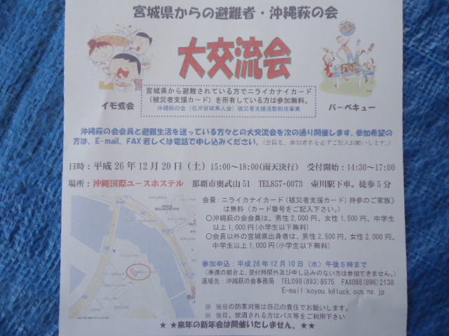 今年もあと1ケ月、宮城県からの皆様にはお変わりなくお過ごしのことと拝察申し上げます。 震災から来年の3月で4年になります。沖縄には今も150名を越す宮城県からの避難者が訪れています。その皆さんと毎年、新年会を通して情報交換、親睦会を行ってきましたが、今年は12月に、故郷宮城の芋煮会を再現することになりました 。 多くの皆さんで近況を語り合いましょう。お近くの皆さんへ、お声えかけ願います。 沖縄萩の会 大交流会 日時 平成26年12月20日(土)15時~18時 (雨天決行) 受付開始1...