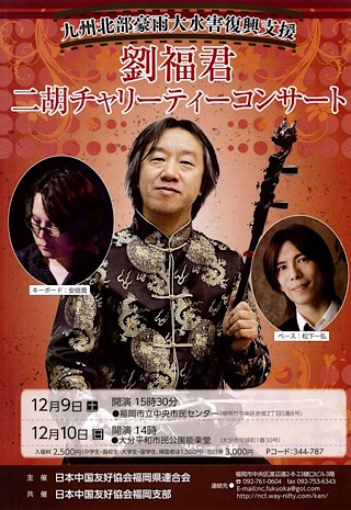 二胡コースの劉福君講師出演 九州北部豪雨大雨災害復興支援チャリティーコンサートが開催されます。 日時 12月9日(土)15:30-17:30 会場 福岡市立中央市民センター 入場 2500円(中高大生、留学生、帰国者1500円)、当日3000円 主催 日本中国友好協会福岡県連合会 連絡 電話092-761-0604 nc.fukuoka@gol.com(日中友好協会) 二胡コース http://www.kawai-fukuoka.jp/cn24/pg435.html JUGEMテーマ:二胡