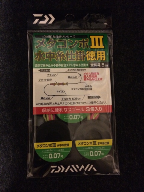 JUGEMテーマ:魚釣り 新製品は黄色が出て興味があったのだが、特売品をせっせと買い込んだメタコンポ ? がまだ封を切ってもない状態だった。 で、ひと組何回巻くんだよ、と思っていたら、メタコンポ III の水中糸仕掛が売っていたので買ってきた。 上つけ糸は意外に長くて、85センチ。チチワを作ってがまかつの仕掛け巻きで5回転(端数は切り捨て)。水中糸は3.3メートル(24回)。下つけ糸は35センチなので、縮めて1回。 本題はここから ♪ なのだが、メタコンポ ? は15メ...