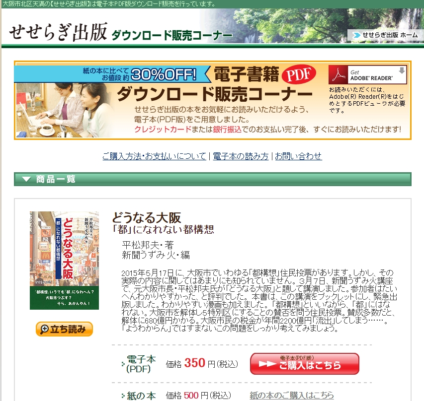 いわゆる「大阪都構想」にからみ、大阪市を解体し5特別区に分割することの是非を問う住民投票が5月17日に行われます。 せせらぎ出版では、これにむけ、『どうなる大阪 −「都」になれない都構想−』(平松邦夫・著、新聞うずみ火・編、ブックレット40頁、税込500円)を緊急出版しました。 5月17日まで約1ヵ月しかありませんが、より多くの人にこの住民投票で問われている問題点を正確に知っていただくために、紙の本だけでなく、電子本(PDF版)もあわせて発行しました。 電子本は税込350円です。クレジットと銀行振込のどちらか...