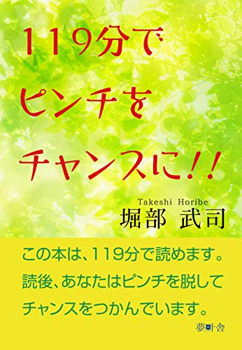 『119分でピンチをチャンスに!!』堀部武司 (著) 紙の本、本日発売しました! 電子書籍はこちら! この本は、119分で読めます。読後、あなたはピンチを脱してチャンスをつかんでいます。 <推薦のことば1> 全てが必然 大川創業株式会社代表取締役 大川 進一郎 この本は、人生最悪のピンチに立った時の処し方が書かれているので、この世にもう何も恐ろしいもの、悲しいものはありません。 文中、堀部さんは御堂筋パレードに百名のチンドンヤの一人として...