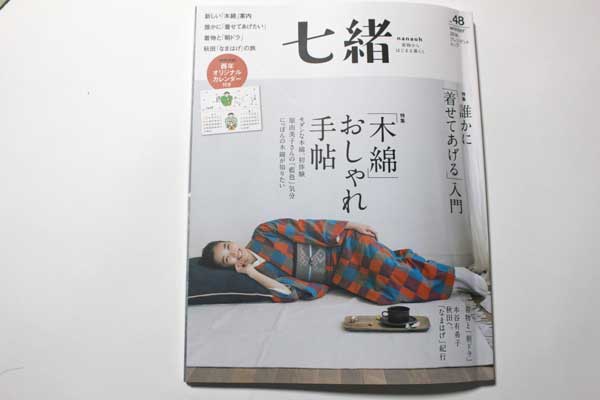 JUGEMテーマ:普段着物のお話 七緒の最新号が発売中。 今回は木綿の着物の特集を組んでいます。むらまご呉服店では毎号取り寄せています。 木綿やシルクウールなど着物の中でも「カジュアルきもの」にあたるものも豊富に紹介。 片貝木綿のカラフルな木綿着物が表紙をかざっています。 定番の格子模様をはっきりした色合で。木綿の着物はらく〜にリラックスして着ていただきたい着物。 七緒の表紙のようにねそべって着れるくらいのカジュア...
