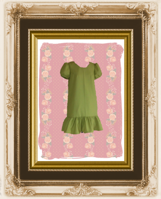 グリーンのワンピース 裾のラインにギャザーが寄せてあり、ひらひらしています。 袖はパフスリーブです
