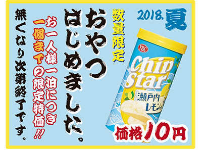 こんにちは! 8月も半ばを過ぎて、少し過ごしやすくなりましたね。 しかしながら、岡山は最高気温30度を超える日がまだ続くようです! 朝夕は涼しくなってきたので、体調管理にお気を付け下さいね。 さて、ホテルマイラでは、新しいサービスをご提供いたしております♪ その名も【おやつはじめました。】 残暑にもピッタリな、サッパリ&酸っぱいチップス(^^♪ \\\ 瀬戸内レモンチップスター /// 3時のおやつに!ビールのおともに...
