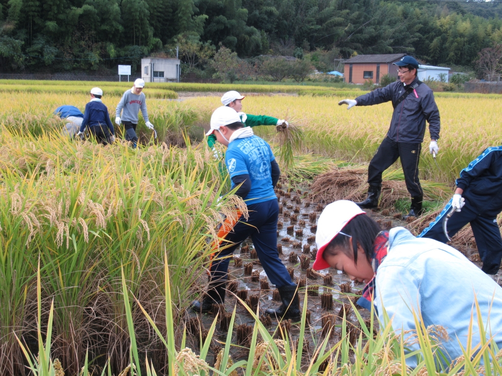 JUGEMテーマ:季節の旬なもの 今年は雨 雨 雨の中 やっと稲刈りをしました 5.6年生6人と校長先生と担任の先生です 田んぼには雨のせいで水がたまっていました が 毎年この田に植えたお米を 小学校の生徒たちが収穫します うれしそうな声が高らかに響きます 本来なら機械が動いているはずですが・・・ 生徒は一株、一株鎌で刈ります おいしいお米が食べられます &nbs...