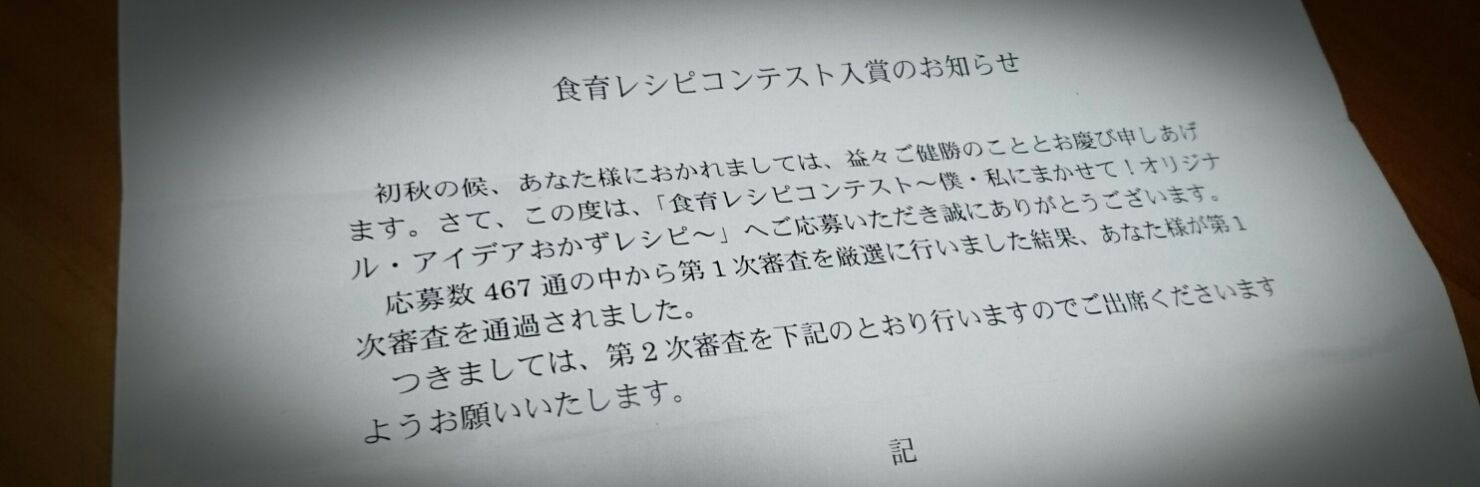 こんばんは。 さっきまで寝てた〜 また台風接近よね・・・明日大丈夫かな・・ 見て見てっ 夏休みの宿題で出したレシピのやつが入選!! 応募数467通の中から5人選ばれたって///びっくり。 行ってきたょ二次審査! 二次審査は40分の制限時間内で1人でお料理を完成させる。 ママに似て緊張もせずマイペースに作るちび豆・・・見てるママの方がヤキモキしたゎぁ 他の4名はみんな5年生でちび豆だけ2年生。しかも一番前の調理台で保護者席か...