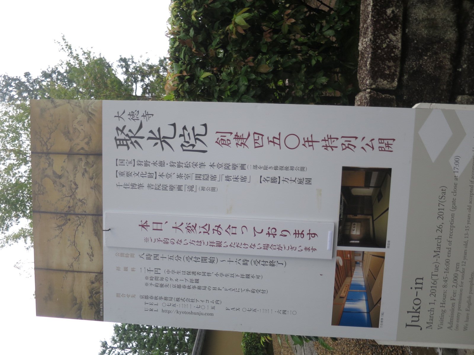 JUGEMテーマ:季節の旬なもの #聚光院 #壁画 #茶室 #庭園 #国宝 #重要文化財 #大徳寺 大徳寺 聚光院 創建450年記念 特別公開 千利休 菩提寺 狩野永徳 国宝障壁画 雨の中 先輩が予約を取りに行ってくださって、私と友人は 最後の時間に入れました。 大徳寺の前で 降ろしてもらって 急いで 聚光院まで行って 入り口で予約の名前を言って 2000円を払って 門の中へ 手荷物を全部預けて パンフレットと青い札をもらって お庭から説明を聞きました。 名勝 方丈庭園 『百積庭』中央...
