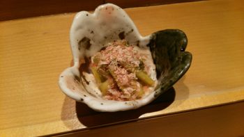 JUGEMテーマ:季節の旬なもの JUGEMテーマ:東京 JUGEMテーマ:銀座でランチ JUGEMテーマ:寿司 ワサビの茎のおかか和え シンプルですが、非常に手間がかかる一品。ですが、その分かなり絶品。 ワサビの茎 静岡県は伊豆市から産地直送で仕入れている為、鮮度も抜群。口に入れた時にワサビ特有のツンとした辛さが広がり、さらにはシャキッとした歯ごたえが、ビールや日本酒とも相性が良く、お酒がすすむとお客さまからも好評の一品です。 手間隙かかる為、常時メニューとしてお出しできる品ではない...