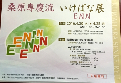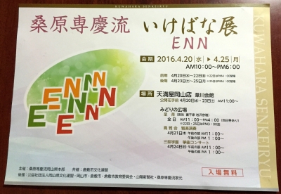 JUGEMテーマ:季節の旬なもの 来る4月20・21・22日(前期) 4月23・24・25日(後期) 会場 天満屋岡山店 6F葦川会館 いけばな展が開催されます お待ちしています 素敵なポスターが出来ました テーマ ENN 会場で好きなえんを探してみましょう お待ちしています