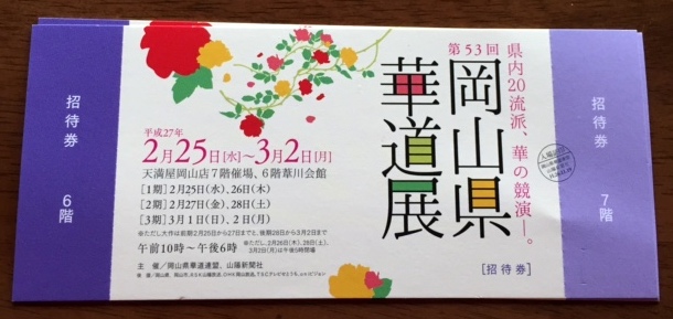 JUGEMテーマ:季節の旬なもの 明日 平成27年2月25日(水) 第53回岡山県華道展が始まります 1期 2月25日(水)〜26日(木) 2期 2月27日(金)〜28日(土) 3期 3月1日(日)〜2日(月) です 桑原専慶流は1,2,3期とも 会場は6階 葦川会館です 又 大作は会長 鈴木秀映先生です 会場は6階です 春爛漫のいけばな展をお楽しみください