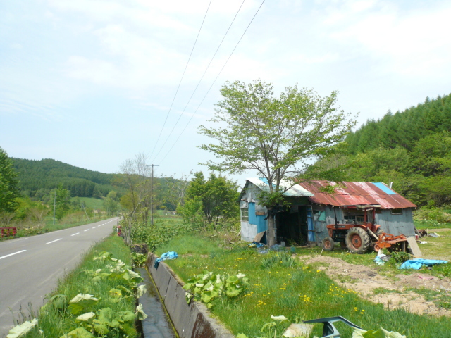 平成27年5月29日(金)、北海道・道北の廃校廃村への旅、 東陵小学校跡と二又(東和寄り)バス停の間、主要道沿いには 畑と作業小屋、往時の住居と思われる家屋が見られる。 地形図で見て、道路の右側には、トラクターが置かれた作業小屋がある。 周囲には畑があり、通いで耕作されている様子だ。 道路の左側には、木造二階建ての風情ある家屋が建っている。 今は物置として使われているのであろうか。 そばに大きなマツの木が立っているのが印象的だ。 新旧の住宅地図の比較で、推定した東和開拓の閉村時期は 平成12年頃...