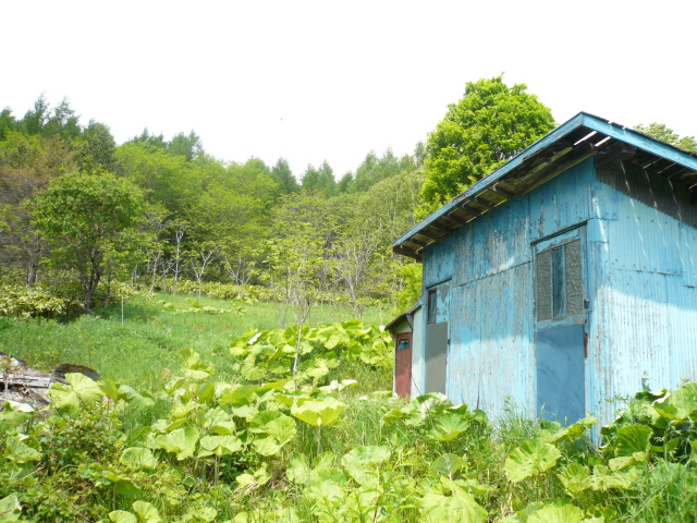 平成27年5月29日(金)、北海道・道北の廃校廃村への旅、 東和開拓の探索の目的地、下司さんの生家跡は、残念ながら屋根が大きく陥没していた。 中をうかがうと、いろいろなものがガレキになっていた。 木で造られた棚や机は、少しずつ朽ちて、土に還ってゆくのだろう。 ブロックのコーナーとなっている場所は、窓ガラスが割れずに残っていて 部屋の雰囲気を醸し出していた。 「誠実 勤労 前進 和寒高校」の貼り物は、成瀬さんの写真で目になじんだもので、 しっかりと残っていて、嬉しかった。 画像1:開拓農家跡...