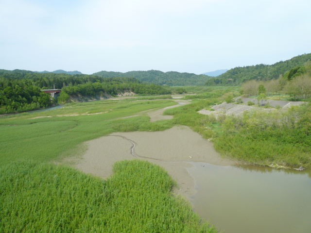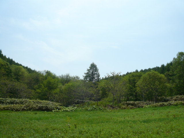 平成27年5月29日(金)、北海道・道北の廃校廃村への旅、 東和開拓の探索の目的地、下司さんの生家跡は、Mさんの開拓農家跡よりも奥にあることは間違いない。 しかし、道筋は定かではなく、川近くの道筋がありそうな場所はササ藪となっている。 朝に届いた成瀬さんからのメールを見直すと、 「遥か先に「不自然な松」の気が見えますので、それを目標にすると良いと思います」 と記されている。 行く手の方向を見ると、谷間に一本高い木が見える。 幸い、木までは広い草原が続いているので、 田中さんと「あの木を目指して...