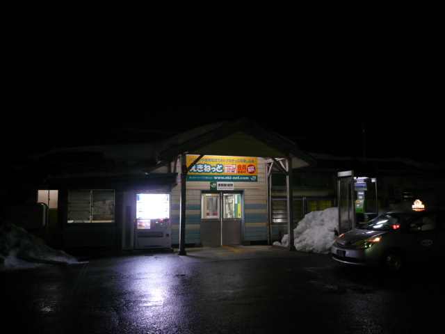 平成27年2月8日(日)、秋田県の廃村への旅、 大館から青森に向かうローカル電車は、青森の2つ手前の津軽新城という無人駅で 5分ほど停車したので、途中下車してみました。 どこに行くわけでもなく降りたった駅前は、閑散としていましたが 一台タクシーが停まっていました。 鷹巣から降りはじめた雨は、どこかで上がったみたいです。 画像1 : とても静かな津軽新城駅前 画像2 : 駅舎の入口は、どこか古い校舎のようだった (2015年 2月8日(日)午後6時50分頃) JUGEMテーマ:ふるさと
