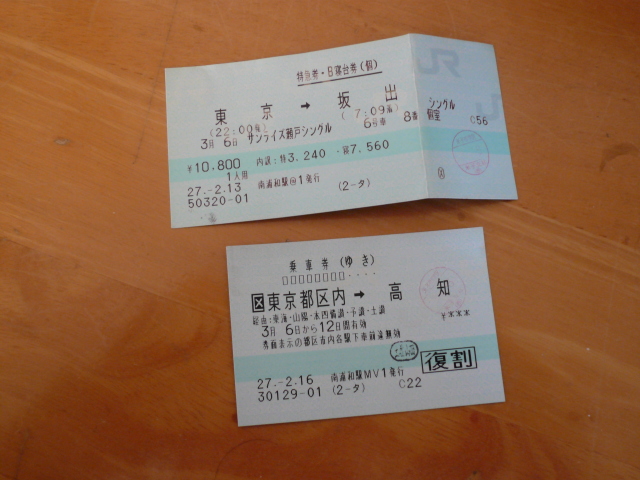 平成27年3月6日(金)〜8日(日)、高知県の廃村への旅、 高知県にはバイクでは4回足を運んでいますが,鉄道には乗ったことがありません。 計画を立てているうちに,高知県の鉄道に乗車すると,鉄道乗車の全県踏破の達成となることがわかりました。 「鉄道に乗るなら,印象に残る乗り方をしたい」と思い,往路のJRは新幹線ではなく, 東京から四国へ向かう夜行特急「サンライズ瀬戸」を使うことになりました。 夜行特急で四国へ向かうのも初めてのことです。 画像 : 東京−高知の往復きっぷと 「サンライズ瀬戸」東京−坂...