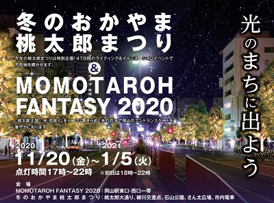 11月半ばを過ぎ、季節がひとつ進みかけていますね。 岡山では日中、コートの出番はなく過ごせていますが、 来週からは少し気温が下がるようです。 さて、今週末から岡山市街では、 駅前広場をLEDイルミで装飾する冬のイベント 【MOMOTAROH FANTASY2020】が開催されます。 今年は桃太郎大通りや石山公園を華やかに演出する 【冬のおかやま桃太郎まつり】を同時開催。 当館のすぐ横の緑道公園では西川イルミもお楽しみいただけます。 岡山駅からキラキラ輝く街をお楽しみください♪ ...