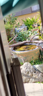JUGEMテーマ:犬猫多頭飼い・日々あれこれ かなり拡大してみてね。 見えるかな〜? 水甕の右の枠に、とても可愛い色した小鳥さんが遊びに来ました。 この時はつがいできていたのですが、隠し撮りは一羽だけしか撮れませんでした。 少し暖かくなってきたせいか、庭の木に刺したみかんを食べにメジロも来ています。 可愛いですよね〜。 春が近くなると、小鳥さんたちもウキウキ嬉しそうに飛び回っています。