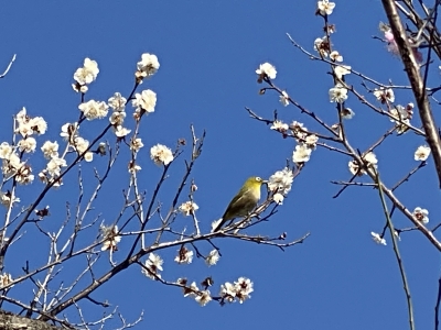 JUGEMテーマ:犬猫多頭飼い・日々あれこれ 昨日はポカポカいいお天気でした。今日は打って変わって朝から雨〜。 お散歩も行けないや。 昨日、古墳の梅を見に行ってメジロさん発見。 メジロさんって結構逃げないんですよね〜。 携帯で写真撮っても、一生懸命梅の花を突いてました。 めじろって、本当に目の周りが白い、、、、。
