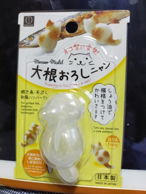 JUGEMテーマ:犬猫多頭飼い・日々あれこれ 昨日、100均にお買い物に行った。 そこで面白いもの発見。 「大根おろしニャン」。 大根おろしで猫型を作り、お醤油で色つけるらしい。 これ、可愛いんでない? 焼き魚なんかで大根おろしついてくるのがこれだったら嬉しくない? でも、夜は焼き魚でなかったので、これの出番はなかった。。。。