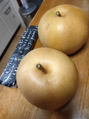 JUGEMテーマ:犬猫多頭飼い・日々あれこれ 毎年、家人が高校時代のお友達と吉野に梨狩りに行きます。 今年も雨の中、昨日行ってきました。 家人はちょっと集合に遅れたので、お店の人が家人の分を梨狩りしておいてくれたそうです。 今年の梨は「大天梨」という種類だそうで100年に一度の品種だそうですよ。 まだ食べてないけど、大きな大きな梨。 秋っていいねえ。美味しいものいっぱいだ。