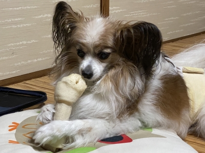 JUGEMテーマ:犬猫多頭飼い・日々あれこれ 大きなわんこが遊ぶような、骨型ガム。 結構重たいんですが、器用に手で押さえてかじっています。 小さなガムだと飲み込んでは危険ですのでこれにしています。 これが小さくなるのはあんまり考えられない。 もうかれこれ5年持っていますからね。 骨型ガムと闘う男。 今日はまろくんのおサロンデイ。 10時にお迎えがやってきます。