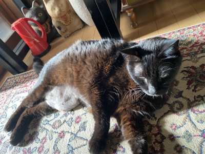 JUGEMテーマ:犬猫多頭飼い・日々あれこれ 我が家の主、あんこ大先生です。 暑い夏は本当に暑そうで、あちこちでグダグダしています。 昨日も玄関前で〜。 お腹は出てるし、ハゲてるし。 でも貫禄だけは十分あります。 もう13歳。 なかなかいいお年になりました。でも変わりなく「あんこ大先生」の風格はしっかりありますよ〜。 今回はブログのお友達、マイラさんのご希望で登場していただきました。