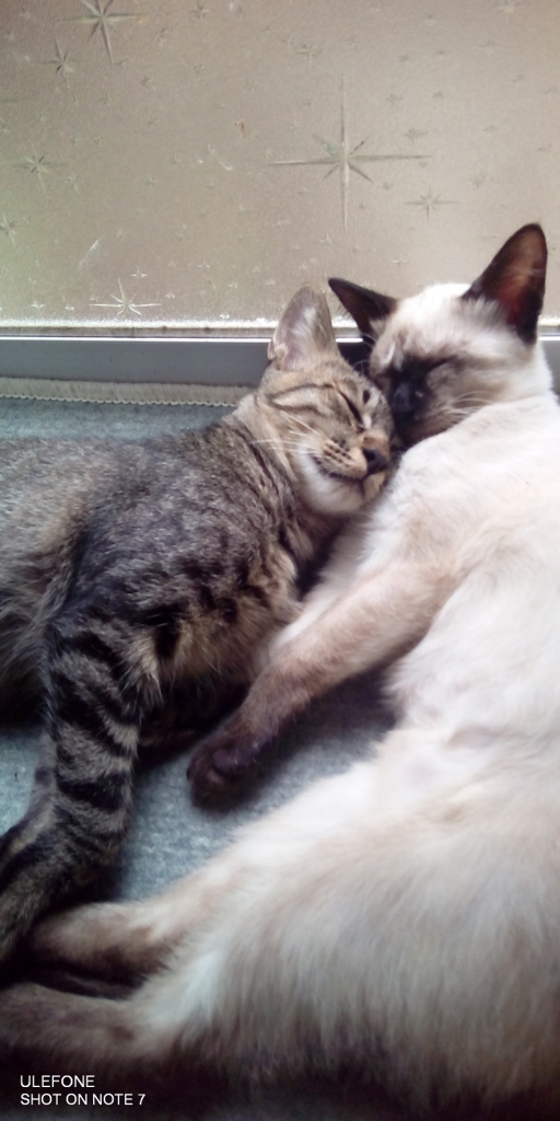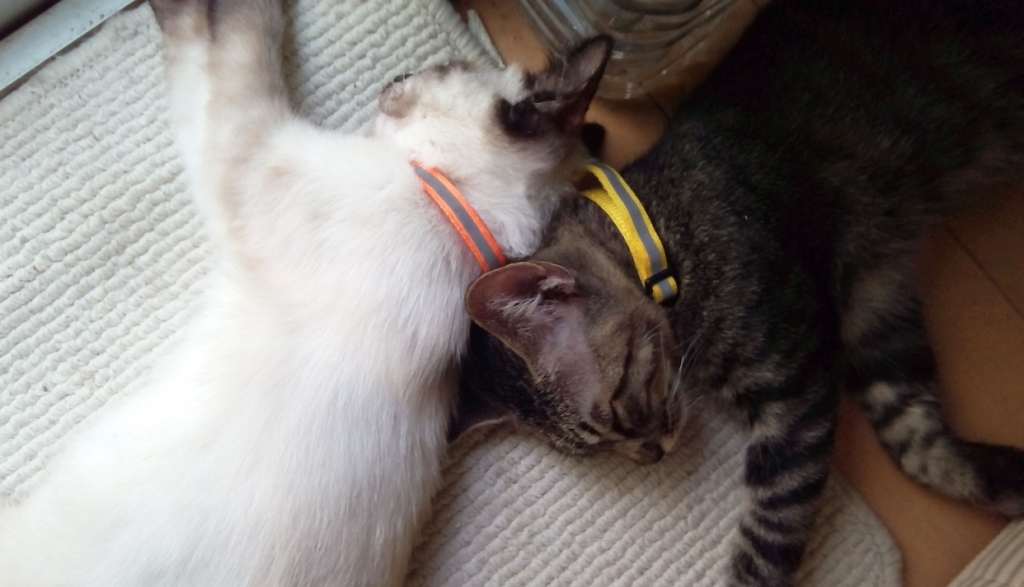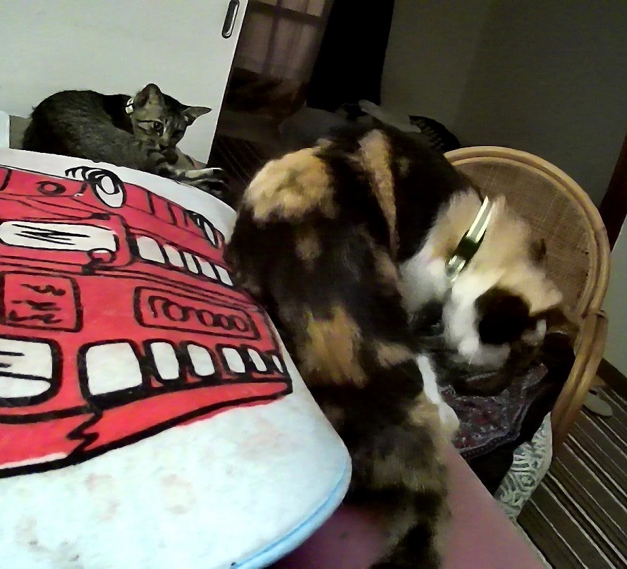 JUGEMテーマ:犬猫多頭飼い・日々あれこれ 午後の時間などずっと眠り続けるヴィックとヌックをみていただけに昨日、今日ともう大変な活動ぶり。相手を追い、あるいは追われて室内を突っ走る。カーテンに跳びつく。特にヴィックはカーテンレールの高さまで到達。なぜなのか、ともかくカーテンに跳びつきたがる。その下あたりで組んずほぐれつして厭きない。また走り出す。これまでは運動をして、そして休む時間に入る。というように見て、ほどほどのところで運動は終了すると見ていたところが全然止む気配がない。小休...