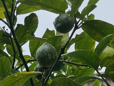 JUGEMテーマ:犬猫多頭飼い・日々あれこれ 雨に打たれるレモンちゃん。 だいぶんと大きくなってきましたよ。 レモンらしい形に。でもね、これがどちらかというと丸いレモンになってしまいますけどね。 これからどんどん実が大きくなって、秋には色もついてくれます。 今年も豊作。いいですね〜。