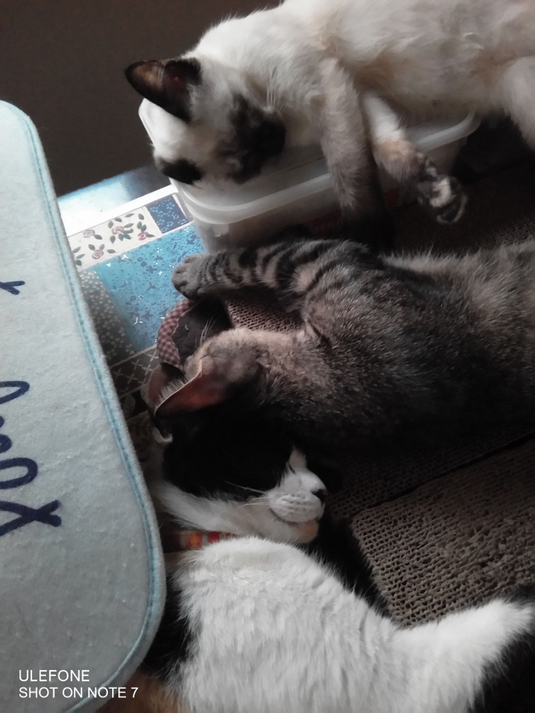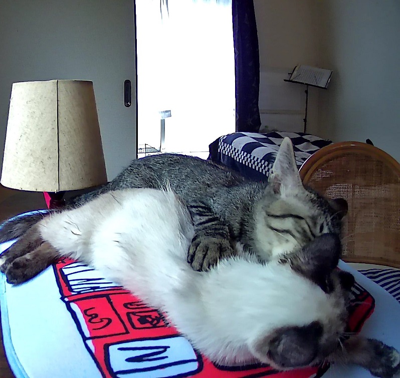 JUGEMテーマ:犬猫多頭飼い・日々あれこれ 3匹共に揃ってよく眠る。午後も、夕刻の後も、起きて動いている時間は挟むけれども、やっぱり思い思いの格好で、あるいは同じように顎を上に向けたような格好で、平和そのものの眠りに落ちている。至近で子猫たちが動いていてもナヌーが全く影響されずに眠り続けるのも見る。画像としてもじっとしていてくれる眠っている時の方が撮りやすい。 ところで午前のある時間だったりするけれども、体がふわふわで弱そうな雌の...