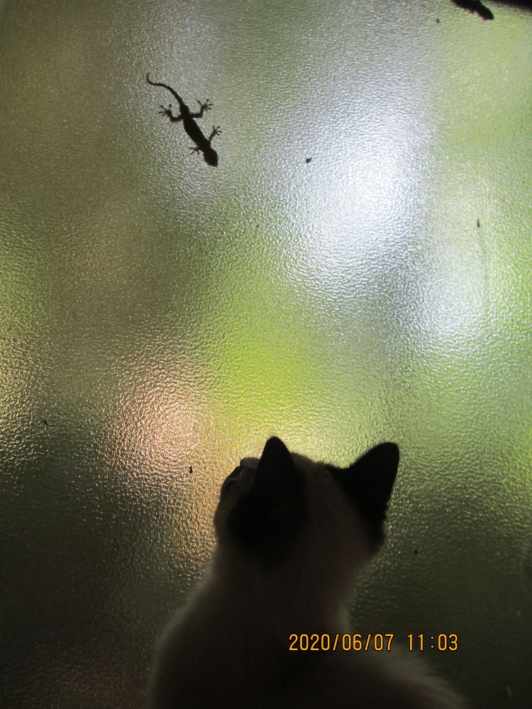 JUGEMテーマ:犬猫多頭飼い・日々あれこれ 半分は網戸が覆っているのだが、その端側にニホンヤモリが何匹もいて曇りガラス上に姿を現わす。ナヌーもよく跳びかかったものだけれども、ガラス向こうでつかみかかれない。ニホンヤモリは無反応。ヌックも、やはり跳びかかっていた。ヤモリは動きもしない。 このガラス戸は、もう5、6年も前に上の左右の戸の合うごく僅かな隙間から蛇の侵入してきたことがあって、二度とそういうことがないように隙間を塞いであり、開けることは...
