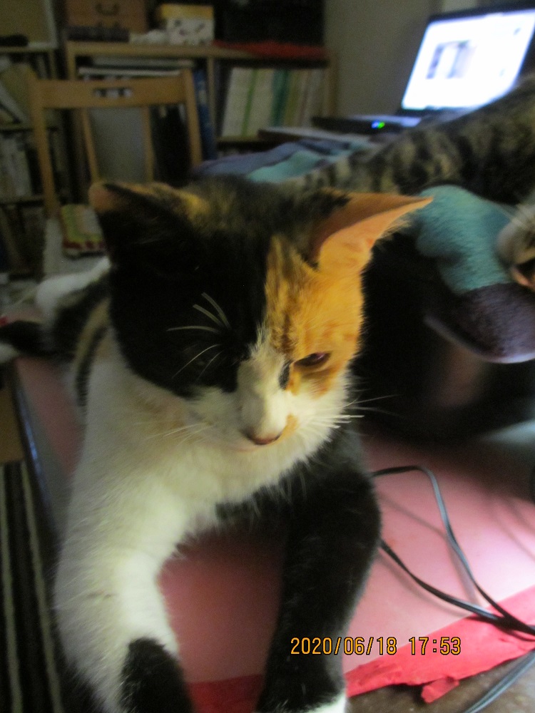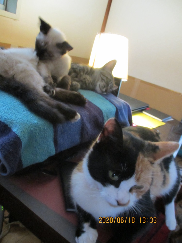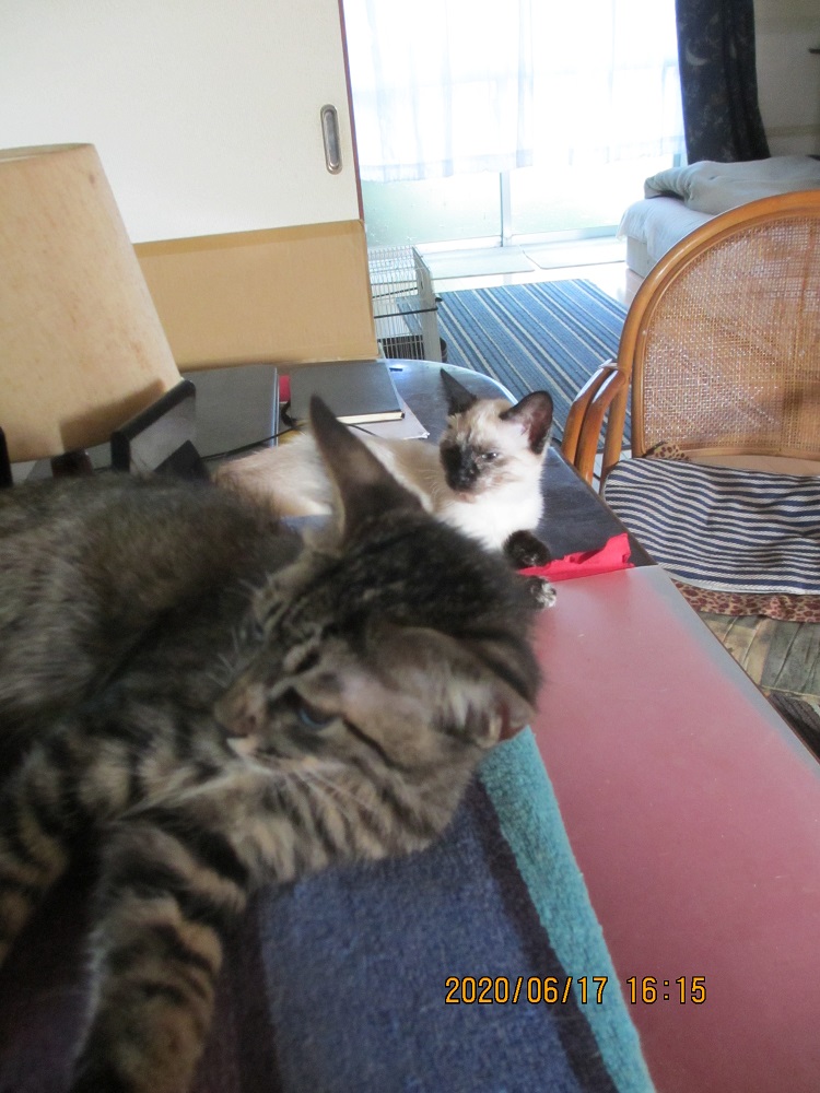JUGEMテーマ:犬猫多頭飼い・日々あれこれ ナヌーは昼に戻ってきてこの画像を撮った時の40分位? はいたけれどもまた外に出て行って17時頃に戻ったのかな。それからは室内。日も変わろうとしている現在、外は雨だしね。 子猫たちも今はそばで寝ているけれども、動き回られると落ち着かない。急に突っ走ってきてテーブルに乗り上がったり。で、何かが落下したり。ナヌーだけの時とは、それは違います。ナヌーもそばを離れないで、何かを求めているふうな感じを見せる。ちょっと離...