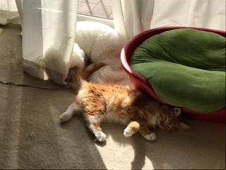 JUGEMテーマ:犬猫多頭飼い・日々あれこれ おチビちゃん、ハッチくんには心を許しているようで 気づけばハッチの側で寝ていることが多いような気がします。 今日も2人で窓際で日向ぼっこしながら寝ていました。