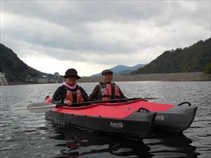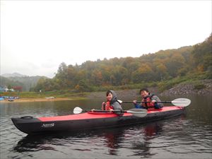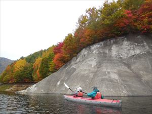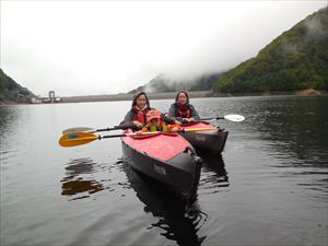 ちょっとポツポツ降ってますけど それほど問題無いかと 風はほとんど無いし こんなお天気だから 雲も低く垂れ込めて ダムの向こうから湧き上がってくるようで 幻想的な雰囲気 しかも 紅葉が雨に濡れて 輝いているのですゎ 写真だと分からないのが残念 前橋と東京からお越しになったお二人さんも 輝いていました 先週はまだまだかな? と思ったけど ピークの始まりですね 後半には空も明るくなり お山もしっかり見えて 終わってみたら 絶好の 紅葉カヌー日和でしたね