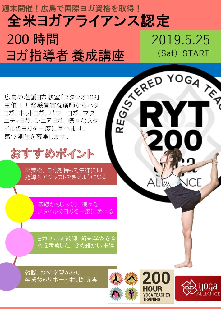いつもこのブログを見てくださって、ありがとうございます。 広島唯一の国際認定校『RYS200』スタジオ103主催の http://studio-103.com/ RYT200(全米ヨガアライアンス認定200時間)ヨガ指導者養成講座 今年もスタートします。 https://www.hiroshimayoga.com 今年は5月25日スタートですよ♪ スタジオ103で説明会を開催します。 3月9日(土)16時30分〜 養成講座のプチ体験付き(^^) RYT200担当講師が、受講に関する疑問や不安を...