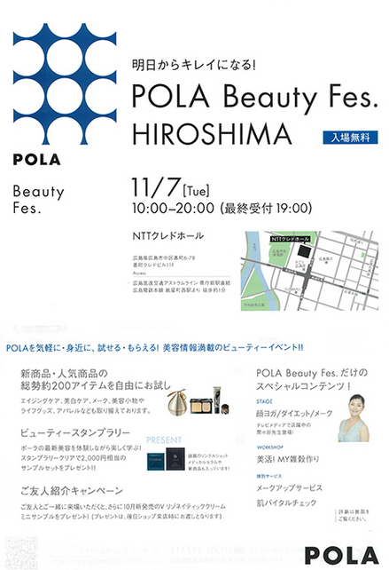 今日は、いい年(1114) アンチエイジングの日 顔ヨガで有名なままちゃんこと、間々田佳子さんが来るとのことで POLA BEAUTY FES HIROSHIMA 2017 へ行ってきました なかなかの賑わいで イベント中のお写真、動画撮影はNGでした・・・ ままちゃんの公式ブログから、福岡の様子をどうぞ https://ameblo.jp/yoshiko-mamada/entry-12327962261.html 立ち居振る舞いが美しく トークもすごく盛り上げ上手 ...