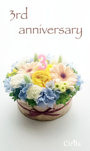 JUGEMテーマ:うれしい☆ 本日2015.5.15でcirilaは三周年を迎えました。 朝からバタバタしていたらこんな時間になってしまいました。 なかなか思うようには何事も進まなくて焦ったり 泣きたくなるようなこともありますが 私にとって花と向き合う時間はとても大切です。 好きなことだから続けていきたいと思います。 これからもどうぞよろしくお願い申し上げます。