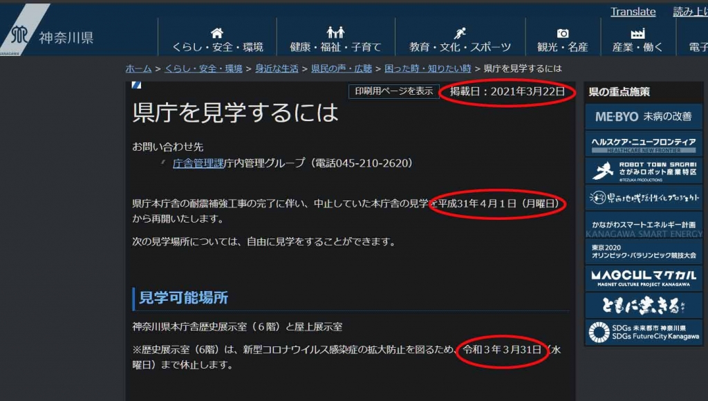 JUGEMテーマ:親爺の独り言 神奈川県庁を見学しようと県のホームページにアクセスしたところ、表示されたのがこちら。 よくも内部チェックを通った物であります。 いや、それぞれ理由があるんだろう・・・。 西暦表記:元号が変わる時のシステム障害を避けるために西暦表示にした。(平成・令和と大変だったんだろうね) 平成表記:耐震補強工事が始まったのが平成○○年なんですよきっと、だから、耐震補強工事のお知らせ起点文書が平成だからそれに合さざるを得ない。 令和表記:新型コロナウイルスは令和の時代...